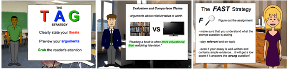 Strategy instruction is provided via eight Strategy Modules that address three main phases of the writing process: prewriting, drafting, and revising. Prewriting modules discuss strategies for freewriting and planning. Drafting modules present strategies for introduction building, body building, and conclusion building. Finally, the revising modules teach strategies for paraphrasing, cohesion building, and overall revising. Each module begins with a series of short, interactive lessons taught by animated characters. The lessons offer step-by-step guides, examples, and mnemonic devices. Every lesson video is followed immediately by interactive Checkpoints that offer review and reinforcement of the content via a quiz-like or game-like format.